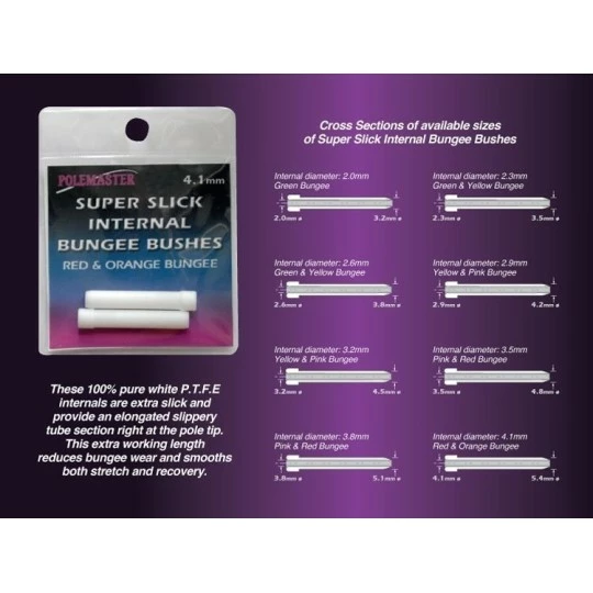 De Super Slick Internal Bungee Bushes van Drennan zijn gemaakt van pure PTFE voor een soepele overgang tussen de hengeltop en het elastiek. Hierdoor gaat het elastiek langer mee en stropt het elastiek niet tijdens het drillen van een vis.