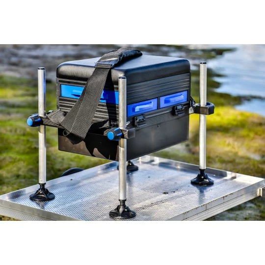 De Lion Sports Seatbox Futura is voorzien van drie lades en een zacht, gevoerd kussen waar je comfortabel op kunt zitten. De zitkist is voorzien van vier modderpoten die ieder los van elkaar in te stellen zijn. Hierdoor kun je de viskist op iedere ondergrond probleemloos horizontaal plaatsen. Doordat de poten voorzien zijn van modderpoten, zakken deze ook in een drassige oever niet weg.