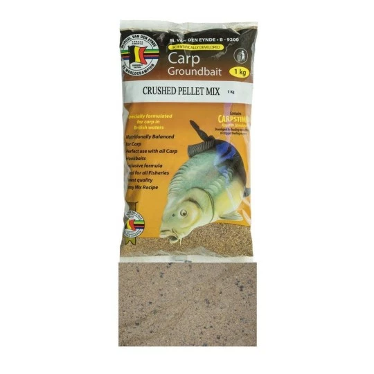 De crushed pellet mix bevat hoogwaardige pellets, vismeel, klein beetje vleesmeel (wat best wat stinkt) en het is vrij grof gehouden door er nog enkele hele pellets in te laten. De visser bepaalt zelf of hij met een grof voeder wil vissen of niet en de grovere delen er liever uitzift.